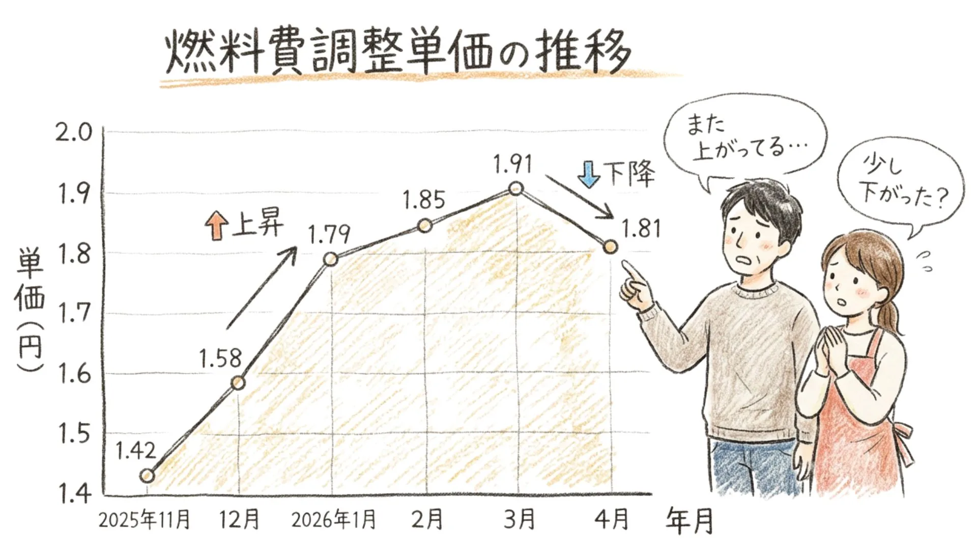 燃料費調整単価は2025年11月から2026年4月にかけて緩やかな上昇トレンドにあることが分かります。