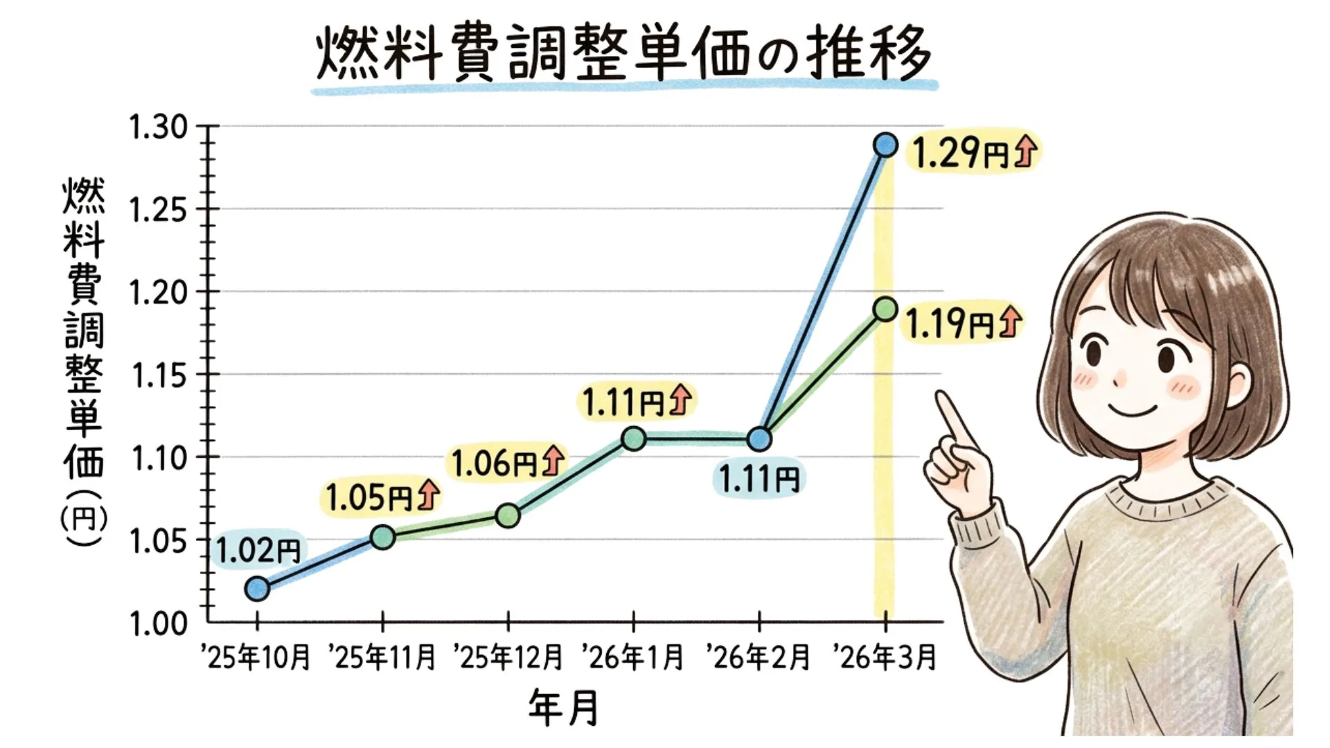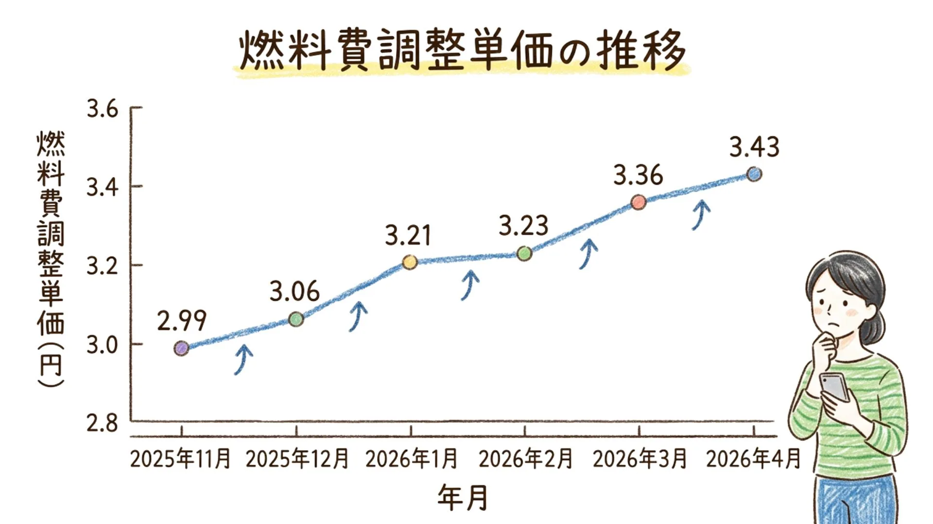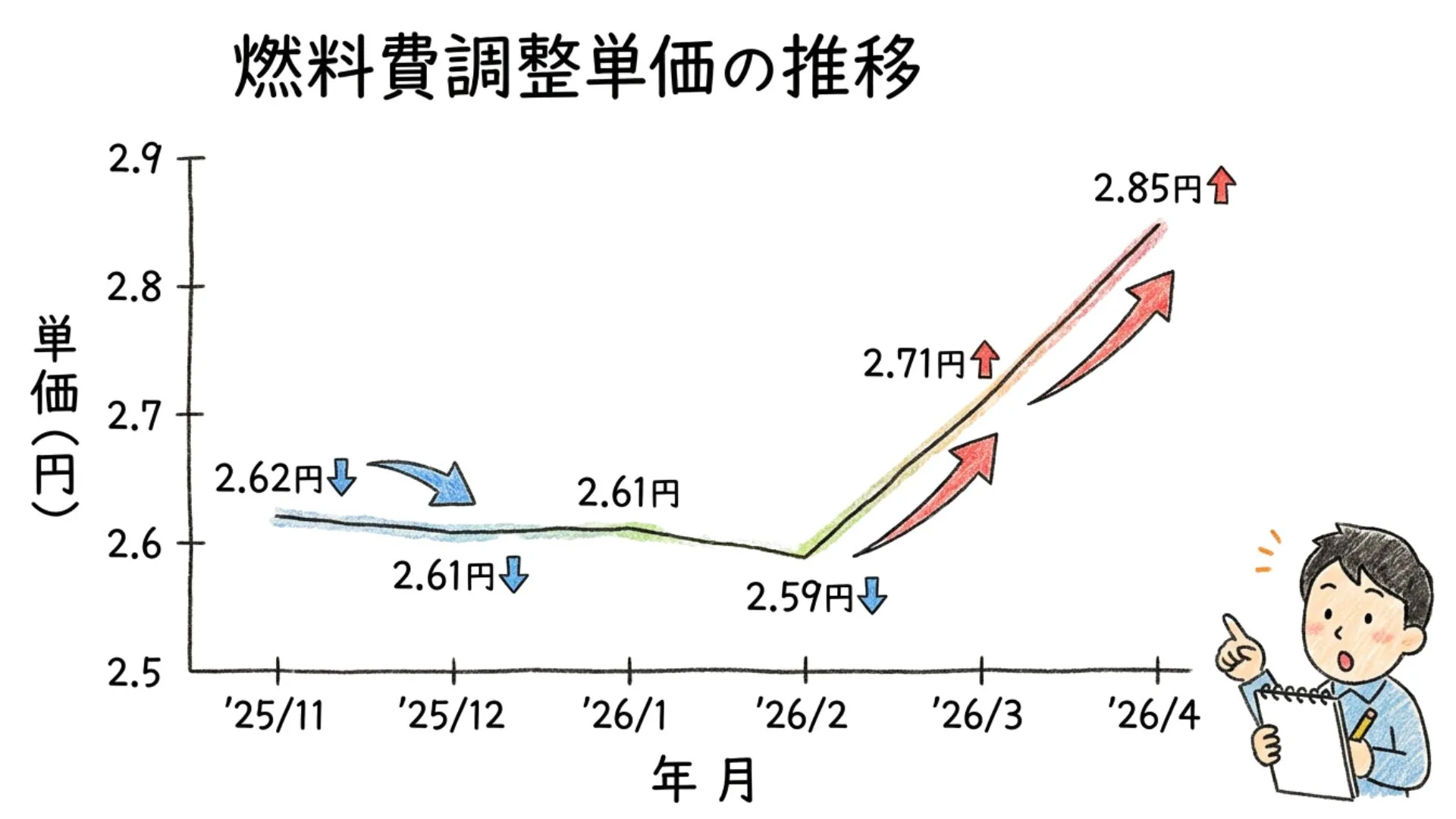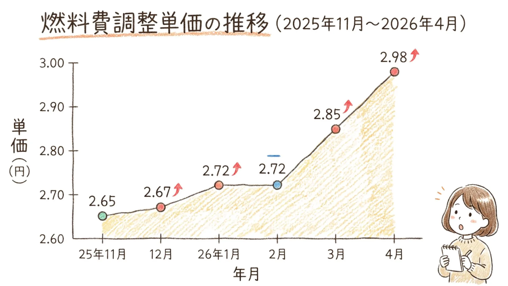 燃料費調整単価は2025年11月から2026年3月にかけて明確な上昇トレンドにあることが分かります。