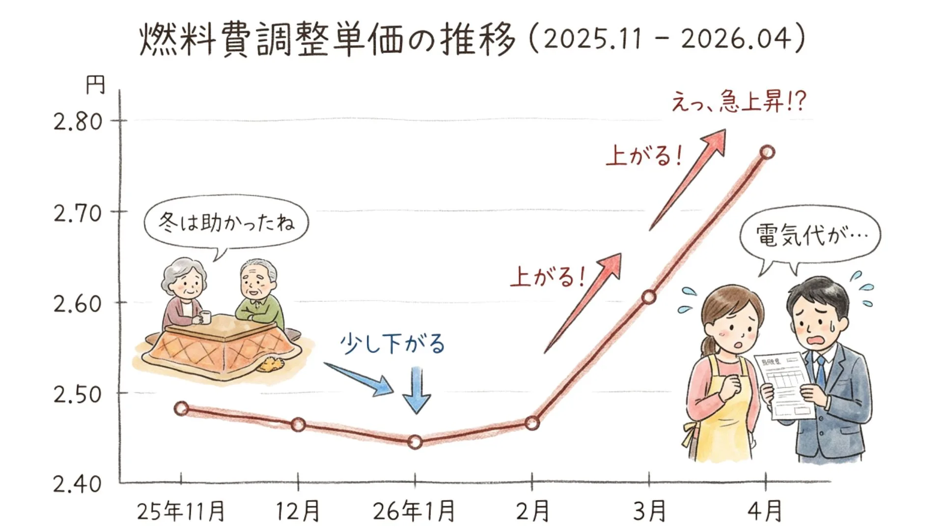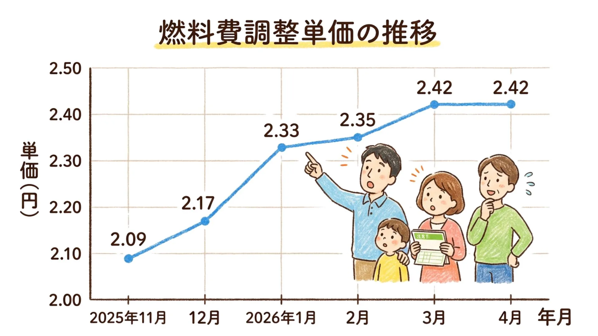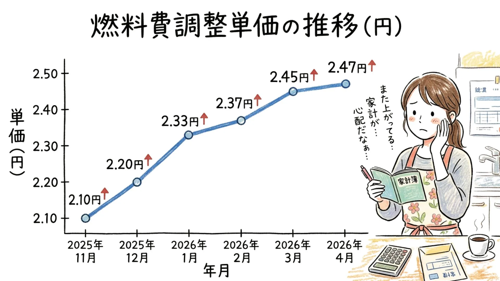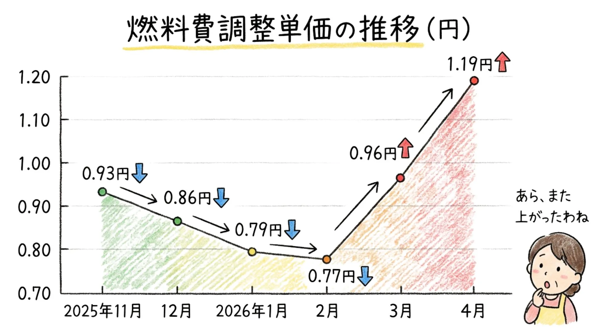 燃料費調整単価は2025年11月から2026年3月にかけて明確な上昇トレンドにあることが分かります。