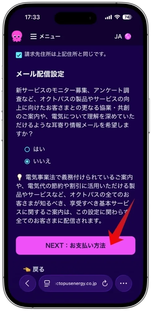 メール配信設定を行い、「NEXT:お支払い方法」ボタンをタップして次に進みます。