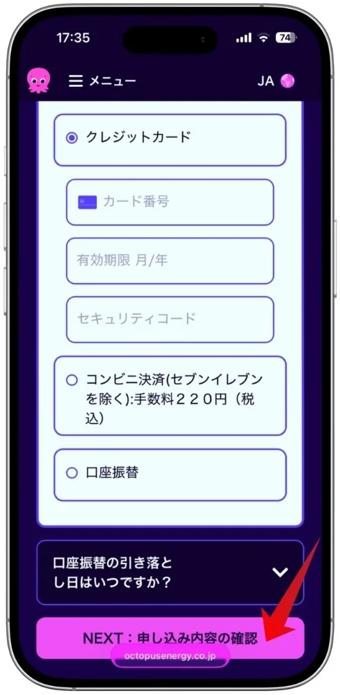 オクトパスエナジーでは、クレジットカード、口座振替、コンビニ払いが利用可能です。