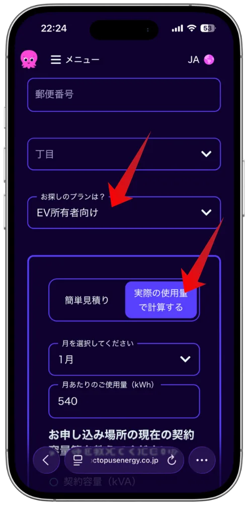 最初に「郵便番号」を入力し、お探しのプランで「EV所有者向け」を選択します。