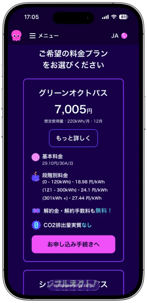 オクトパスエナジーに切り替えた場合の電気料金が表示されるので、どれだけ安くなるかも確認可能です。